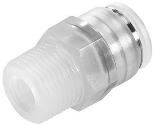 Фитинг цанговый прямой Festo. Материал: полипропилен. Пневматическое подключение: канал 1 - наружная резьба R1/8, канал 2 - цанга под трубку с наружным диаметром D=8 мм. Стойкий к химикатам и гидролизу, безопасный в пищевом производстве.
