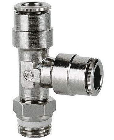 Тройник цанговый поворотный Camozzi. Наружная резьба G1/4 с уплотнительным фторопластовым кольцом PTFE, цанговые зажимы под трубку с наружным диаметром 12 мм.